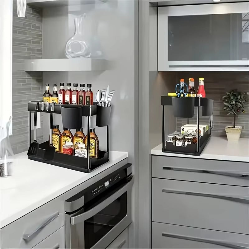 El Organizador Premium de 2 Niveles en color negro mate está fabricado en ABS de alta calidad con tubos de soporte engrosados, lo que le da una estructura estable y capacidad para soportar cargas pesadas.